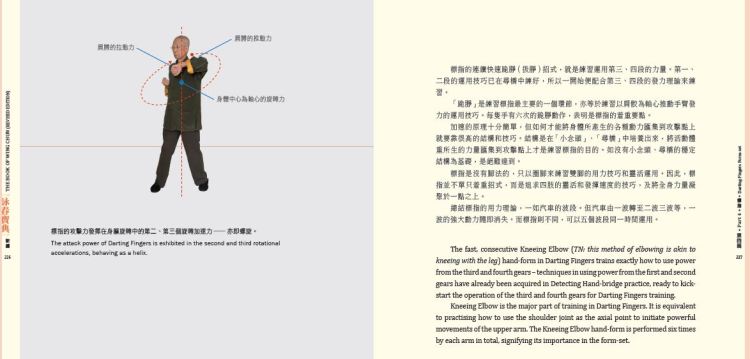 Powers (2) and (3) are the working of the spine initiating the moving of the body – away from the body’s original position for (2) and setting the body to pivot for (3). Power (4) results from the working of the rib cage which then moves the entire shoulder joint. Power (5) refers to the working within the shoulder joint which rotates the upper arm to give out the commonly known Elbow Power. Power (6) comes from the working within the elbow joint that navigates the forearm to achieve focusing (aiming at) rather than pushing or pulling. Power (7) refers to the working within the wrist joint (the smallest among the above) that activates the palm and fingers, and is instrumental in manifesting the power as Sending-power-to-fingertips in Darting Fingers (Biu Jee).