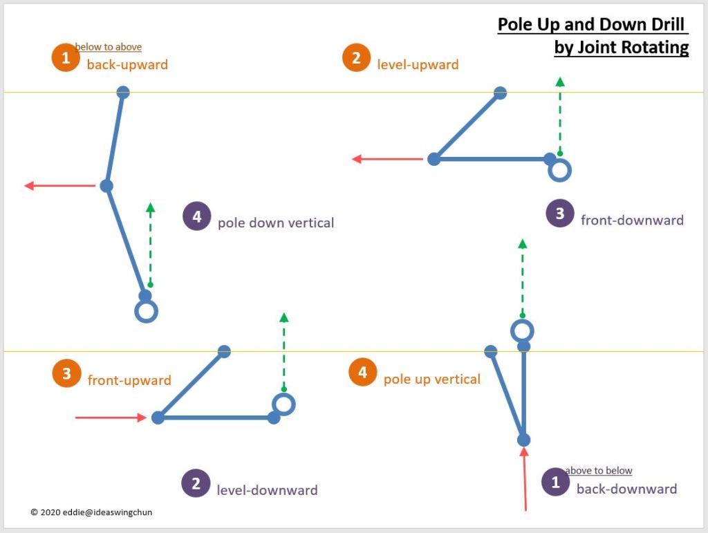 The Wing Chun way is like this. Take the first drill as an example. Use joint-rotating to keep the pole travelling on the vertical pane very close to your body. There is no distinction between up and down, nor out and in; just the elbow joint being rotated (by the shoulder joint) to the back or to the front. When rotated to the back, the elbow joint rotates the wrist centre upward (if the wrist centre is below the elbow; let’s label this as “back-upward”), or downward (if it is above; label this as “back-downward”). The opposite is also true: When the elbow joint is rotated to the front, it rotates the wrist centre downward (if the wrist centre is below; label this as “front-downward”), or upward (if it is above; label this as “front-upward”).