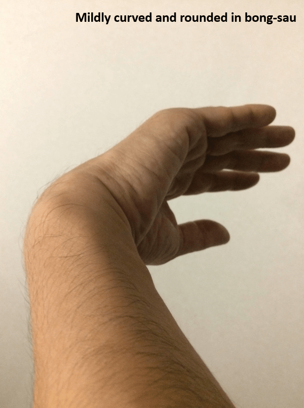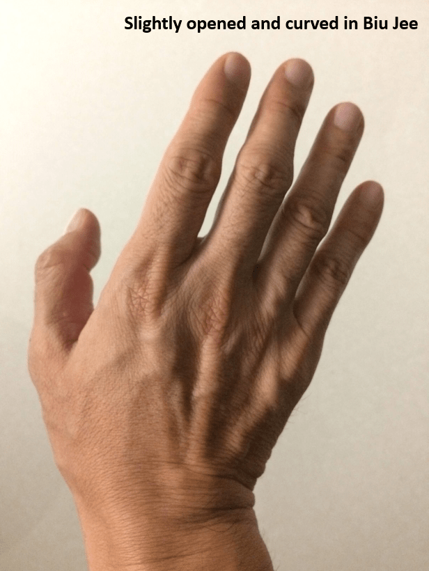 The palm shape can vary widely depending on how it is being used. Apart from a flattened tang-sau in its basic form, it can reshape into slightly opened and curved ready for Biu Jee movements, or deeply rounded with the thumb widely opened for forging the fook-sau taming power, or curved and opened in the half way for directing the bong-sau commonly-felt ‘awkward’ shape (see photos). You can name and describe many more variations, like that in a palm-strike. Compared to the flattened tang-sau, the umbrella analogy might be more obvious in all the other varied shapes since the extended virtual ‘panels’ are more visible between the farther separated pairs of neighbouring fingers. But hang on! – In some of the varied shapes, the thumb doesn’t look like ‘bending and pressing’ at all to trigger the button push. I’ll leave it to your own comprehension and return to it in later posts.