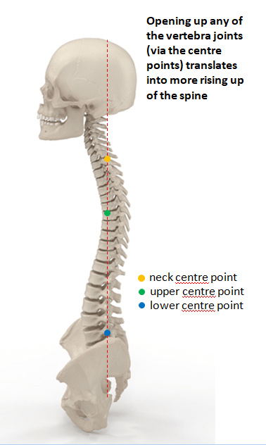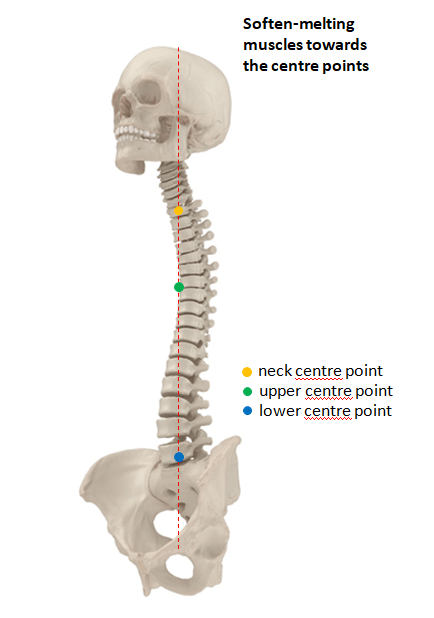 CONCISE GUIDE: There are several centre points along the spine that are typical (pivotal and direct) to start with: the lower centre point (near the belly button), the upper centre point (around the solar plexus) and the neck centre point (connecting to but below the neck). Try to access them by soften-melting the corresponding neighbouring muscles towards them, but not relaxing/dropping muscles down to the floor. When doing so, you don’t ignore the spine as a whole. Instead, keep the intent of extending (but not forcing) the spine along its full length up to the two ends (the head point and the tailbone/anus) so that it is always active in every part. On top of this you carry out the soften-melting exploration.