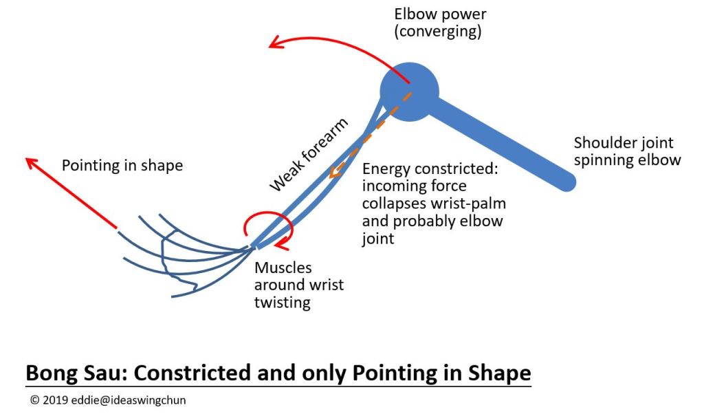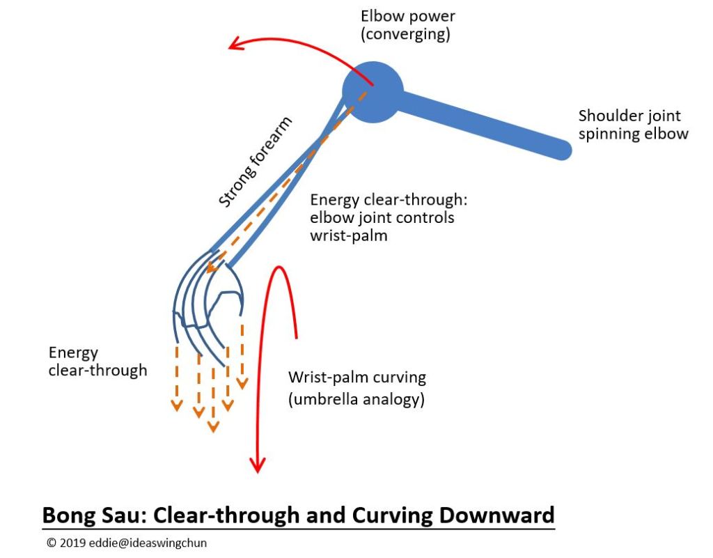 Applying this principle to Bong Sau, as far as the wrist-palm structure is kept clear-through (as manifested as something dynamic inside always passing through the structure), you can see a strong Bong Sau even with the fingers pointing downward! I prefer to describe it as the wrist-palm “curving”, in this case, downward. “Curving” as an intransitive verb (an action) implies a deliberate act on its own to keep and maintain its shape of curve, and the curve can only be maintained smooth when it is clear-through inside. That is to say, “curving” can serve as the intent to gauge how and how much the forearm plus the wrist-palm are clear-through inside. When the forearm up to the fingers is clear-through, the elbow joint is kept free to act, enacting the elbow power to be multiplied by the curving acceleration of the wrist-palm.