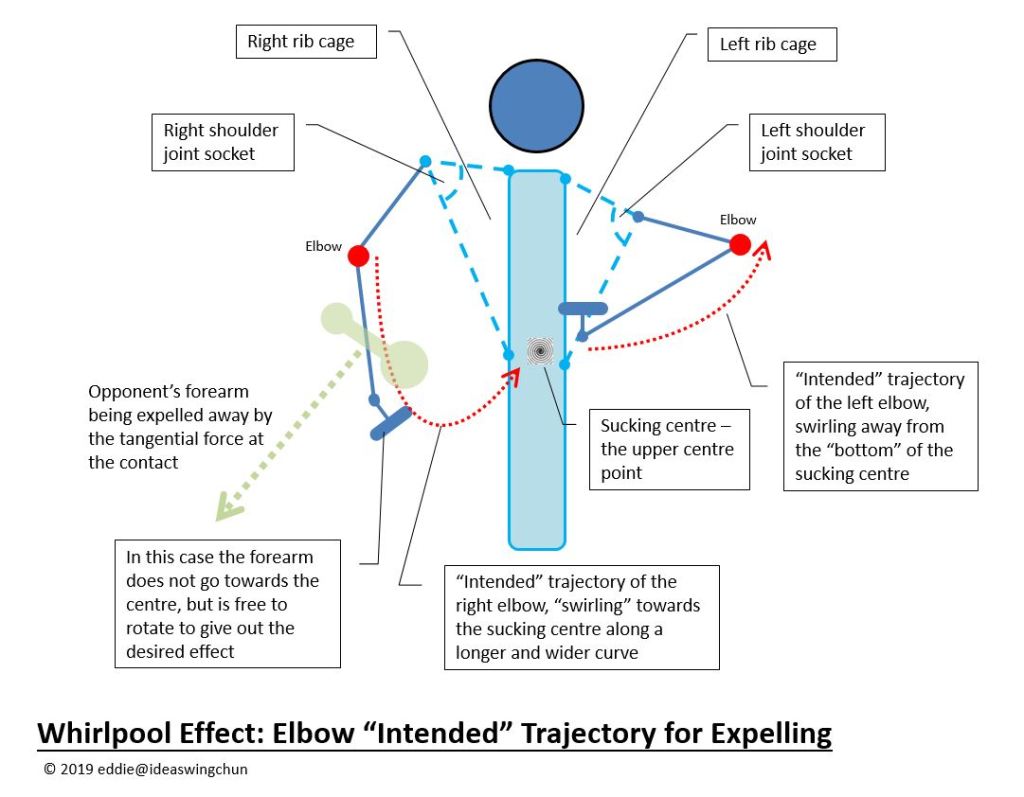 In empty-form elbowing, there is no real force to counter with at the forearm. The forearm then rotates (from the elbow joint) to align with the “intended” trajectory of the elbow towards the upper centre to attain the maximum intensity of swirling. And at this point, we can say, in empty-form elbowing we aim to drive the wrist-palm of the forearm towards the upper centre. But in reality, the forearm will adjust to an angle away from the “intended” trajectory (closer or farther from the body) to make contact with the opponent for making an effect you desire. Since the forearm is freely hinged, the sucking property of the elbow can be fully transmitted to the contact, where force is always applied to the opponent at tangent (another property of a whirlpool). When the forearm rotates closer to the body, sucking effect is increased, manifested as the opponent being driven more downward. When it rotates farther away, expelling effect will become more prominent (the “intended” trajectory of the elbow is still going towards the upper centre, but maybe taking a longer path along a wider curve).