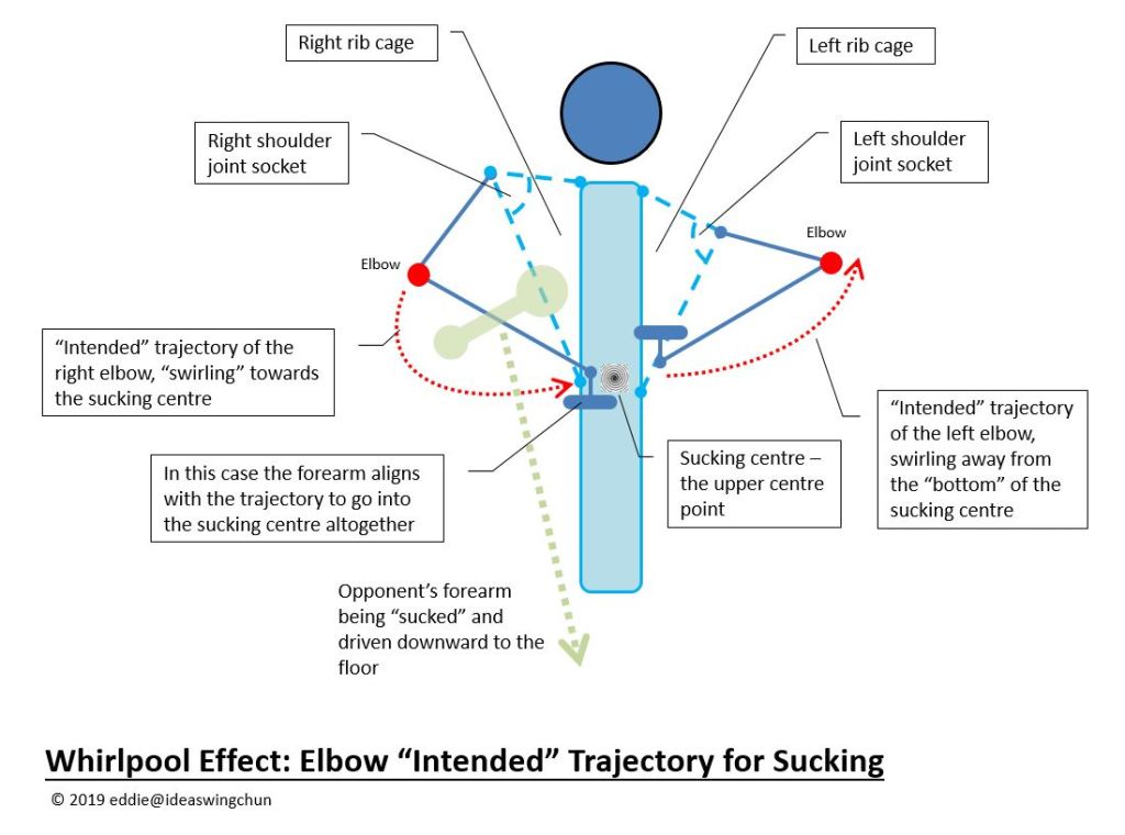 The upper centre point of the body is the centre of whirlpool. We only have one representation of the resultant trajectory – the elbow, which draws out the “intended” trajectory of sucking. The trajectory path is “intended”, because we won’t expect the elbow to actually reach the upper centre. It is an intent – in any Biu Jee movement, you cast an intent on the path that the elbow has to travel for producing the effect you desire. No matter in what shape the path is, it must in the end go back to the upper centre to complete as being sucked, a necessary property of a whirlpool.