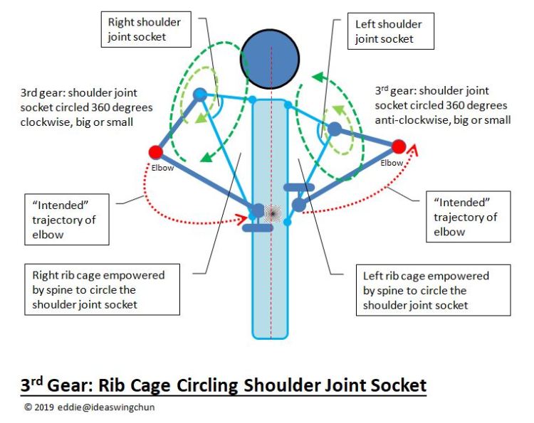 The rib cage has to be free from restrictions caused by muscular contraction in the chest and the upper back. The muscles there have to be sufficiently soften-melted into the rib cage bones and joints, so to speak. This allows the rib cage to be moved by the spine via the direct connections in-between, instead of by muscles. Thus, the spine empowers the rib cage in the way that the rib cage can move the shoulder joint socket a full circle, both clockwise and anti-clockwise. Take the right shoulder as an example, when viewed from the right side, in Biu Jee elbowing, the shoulder socket is being moved clockwise by the rib cage, while the shoulder joint (inside the socket) spins the elbow as usual as in a Tarn-to-Bong or Bong-to-Tarn cycle. Note that the distinct effect seen in whirlpool elbowing is basically brought out by the activity of the shoulder joint socket governed by the rib cage.