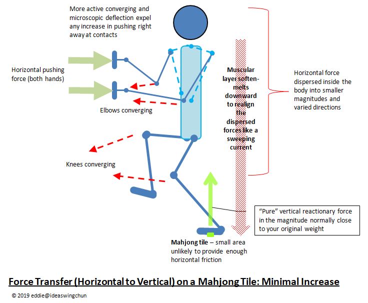 The point-linked structure adjusts its own shape and the directions of joint rotating to control the amount of force allowed to go into and through it, to be transferred to vertical to reach the foot palm and onto the mahjong tile. How does such control work? I propose that it is by ever-converging and microscopic deflection at the contacts (refer to the posts Illustrations – Project, Converge, Elbow Pin, Multi-directional Forces and What’s Happening at Forearm Contacts? – Microscopic Deflection for details). By doing so, any (intended) increase in the pusher’s force will be expelled at the contacts right away and has no chance to go into your body structure. Feeling-wise, the pusher tries hard to push harder, but he cannot hold on to something concrete to exert an increase in his pushing. In this way, the increase reaching the mahjong tile is minimal.