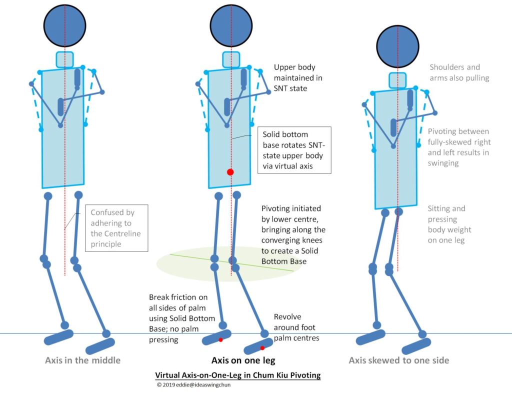 Chum Kiu capitalises on this outcome from SNT to add on rotational momentum from the body. The upper body is maintained in the SNT state. You don’t need to acquire another “new” state to contribute to the pivoting process, especially not using the arms to help start and maintain pivoting. Rather, pivoting is initiated by the lower centre, bringing along the converging knees. This combination forms a solid rotating base at bottom. The upper body need not add anything but kept in the SNT state, as if just being rotated by the solid bottom base via the virtual axis (vertical alignment), something you are to figure out in Chum Kiu.